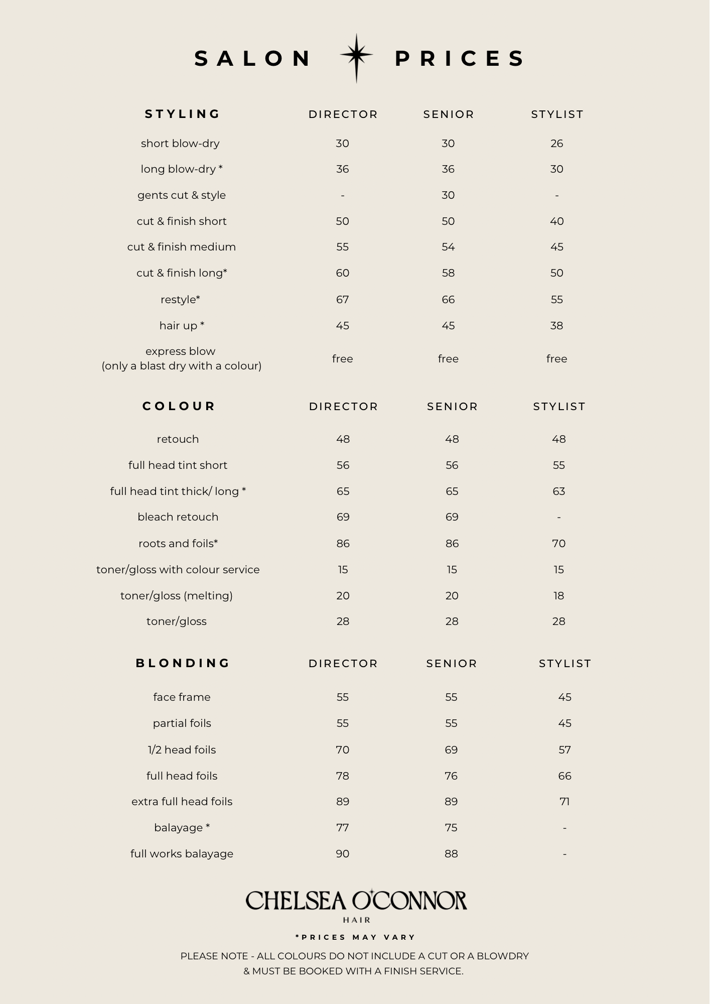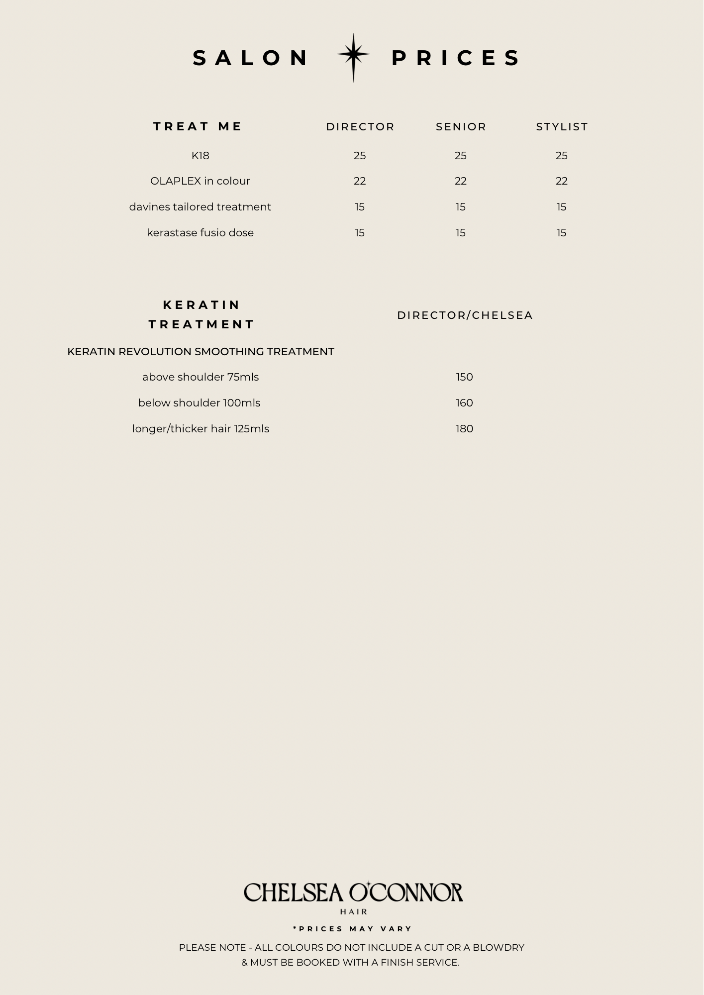 IMPORTANT - ALL COLOUR SERVICES NEED A SKIN TEST AT LEAST 48HRS PRIOR TO APPOINTMENT. PLEASE DROP IN AT YOUR CONVENIENCE, THIS IS DOWN TO YOU. YOUR COLOUR WILL NOT GO AHEAD WITHOUT IT AND YOU MAY STILL BE CHARGED. THANK YOU X